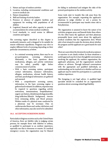 \u0020\u0020\u0020\u0020\u0020\u0020\u0020\u0020\u0020\u0031\u002E\u0020\u004E\u0061\u0074\u0075\u0072\u0065\u0020\u0061\u006E\u0064\u0020\u0074\u0079\u0070\u0065\u0020\u006F\u0066\u0020\u006F\u0075\u0074\u0064\u006F\u006F\u0072\u0020\u0061\u0063\u0074\u0069\u0076\u0069\u0074\u0069\u0065\u0073\u000A\u0032\u002E\u0020\u004C\u006F\u0063\u0061\u0074\u0069\u006F\u006E\u002C\u0020\u0069\u006E\u0063\u006C\u0075\u0064\u0069\u006E\u0067\u0020\u0065\u006E\u0076\u0069\u0072\u006F\u006E\u006D\u0065\u006E\u0074\u0061\u006C\u0020\u0063\u006F\u006E\u0064\u0069\u0074\u0069\u006F\u006E\u0073\u0020\u0061\u006E\u0064\u000A\u0061\u0063\u0063\u0065\u0073\u0073\u0020\u0074\u006F\u0020\u006D\u0065\u0064\u0069\u0063\u0061\u006C\u0020\u0063\u0061\u0072\u0065\u000A\u0033\u002E\u0020\u004E\u0061\u0074\u0075\u0072\u0065\u0020\u006F\u0066\u0020\u0070\u006F\u0070\u0075\u006C\u0061\u0074\u0069\u006F\u006E\u000A\u0034\u002E\u0020\u0053\u006B\u0069\u006C\u006C\u0020\u0061\u006E\u0064\u0020\u0074\u0072\u0061\u0069\u006E\u0069\u006E\u0067\u0020\u006F\u0066\u0020\u0061\u0063\u0074\u0069\u0076\u0069\u0074\u0079\u0020\u006C\u0065\u0061\u0064\u0065\u0072\u0073\u000A\u0035\u002E\u0020\u0050\u0072\u0065\u0073\u0065\u006E\u0063\u0065\u0020\u006F\u0072\u0020\u0061\u0062\u0073\u0065\u006E\u0063\u0065\u0020\u006F\u0066\u0020\u0061\u0064\u0061\u0070\u0074\u0069\u0076\u0065\u0020\u0066\u0061\u0063\u0069\u006C\u0069\u0074\u0069\u0065\u0073\u0020\u0061\u006E\u0064\u000A\u0065\u0071\u0075\u0069\u0070\u006D\u0065\u006E\u0074\u0020\u0066\u006F\u0072\u0020\u0077\u006F\u0072\u006B\u0069\u006E\u0067\u0020\u0077\u0069\u0074\u0068\u0020\u0070\u006F\u0070\u0075\u006C\u0061\u0074\u0069\u006F\u006E\u0073\u0020\u006F\u0066\u0020\u0061\u006C\u006C\u000A\u0061\u0062\u0069\u006C\u0069\u0074\u0069\u0065\u0073\u000A\u0036\u002E\u0020\u004C\u006F\u0067\u0069\u0073\u0074\u0069\u0063\u0061\u006C\u002C\u0020\u0066\u0069\u006E\u0061\u006E\u0063\u0069\u0061\u006C\u0020\u0061\u006E\u0064\u0020\u006F\u0074\u0068\u0065\u0072\u0020\u0063\u0061\u0070\u0061\u0063\u0069\u0074\u0079\u0020\u0074\u006F\u0020\u0070\u0072\u006F\u0076\u0069\u0064\u0065\u000A\u0061\u0063\u0063\u006F\u006D\u006D\u006F\u0064\u0061\u0074\u0069\u006F\u006E\u0020\u0066\u006F\u0072\u0020\u0063\u0065\u0072\u0074\u0061\u0069\u006E\u0020\u006D\u0065\u0064\u0069\u0063\u0061\u006C\u0020\u0063\u006F\u006E\u0064\u0069\u0074\u0069\u006F\u006E\u0073\u000A\u0037\u002E\u0020\u004C\u006F\u0063\u0061\u006C\u0020\u0073\u0074\u0061\u006E\u0064\u0061\u0072\u0064\u0073\u002C\u0020\u0069\u002E\u0065\u002E\u0020\u0073\u006F\u0063\u0069\u0061\u006C\u0020\u006E\u006F\u0072\u006D\u0073\u0020\u0069\u006E\u0020\u0064\u0069\u0066\u0066\u0065\u0072\u0065\u006E\u0074\u000A\u0063\u006F\u0075\u006E\u0074\u0072\u0069\u0065\u0073\u0020\u0061\u006E\u0064\u0020\u0072\u0065\u0067\u0069\u006F\u006E\u0073\u000A\u0054\u0068\u0065\u0020\u0073\u0063\u0072\u0065\u0065\u006E\u0069\u006E\u0067\u0020\u0072\u0065\u0067\u0069\u006D\u0065\u0020\u0064\u0065\u0073\u0063\u0072\u0069\u0062\u0065\u0064\u0020\u0069\u006E\u0020\u0074\u0068\u0069\u0073\u0020\u0063\u0068\u0061\u0070\u0074\u0065\u0072\u0020\u0069\u0073\u0020\u006D\u006F\u0064\u0065\u0072\u0061\u0074\u0065\u006C\u0079\u0020\u0069\u006E\u0074\u0065\u006E\u0073\u0069\u0076\u0065\u002C\u0020\u0061\u006E\u0064\u0020\u0069\u0073\u0020\u0064\u0065\u0073\u0069\u0067\u006E\u0065\u0064\u0020\u0074\u006F\u0020\u0062\u0065\u0020\u0073\u0075\u0069\u0074\u0061\u0062\u006C\u0065\u0020\u0066\u006F\u0072\u0020\u0072\u0065\u006D\u006F\u0074\u0065\u0020\u0077\u0069\u006C\u0064\u0065\u0072\u006E\u0065\u0073\u0073\u0020\u0065\u0078\u0070\u0065\u0064\u0069\u0074\u0069\u006F\u006E\u0073\u002E\u0020\u0050\u0072\u006F\u0067\u0072\u0061\u006D\u0073\u0020\u006D\u0061\u0079\u0020\u0065\u006C\u0065\u0063\u0074\u0020\u0074\u006F\u0020\u0065\u006D\u0070\u006C\u006F\u0079\u0020\u0064\u0069\u0066\u0066\u0065\u0072\u0065\u006E\u0074\u0020\u006C\u0065\u0076\u0065\u006C\u0073\u0020\u006F\u0066\u0020\u0073\u0063\u0072\u0065\u0065\u006E\u0069\u006E\u0067\u0020\u0064\u0065\u0070\u0065\u006E\u0064\u0069\u006E\u0067\u0020\u006F\u006E\u0020\u0074\u0068\u0065\u0069\u0072\u0020\u0070\u0061\u0072\u0074\u0069\u0063\u0075\u006C\u0061\u0072\u0020\u0063\u0069\u0072\u0063\u0075\u006D\u0073\u0074\u0061\u006E\u0063\u0065\u0073\u002C\u0020\u0061\u0073\u0020\u0062\u0065\u006C\u006F\u0077\u002E\u000A\u2022\u0020\u0049\u006E\u0020\u0061\u0020\u006D\u0069\u006E\u0069\u006D\u0061\u006C\u0020\u0073\u0063\u0072\u0065\u0065\u006E\u0069\u006E\u0067\u0020\u0073\u0079\u0073\u0074\u0065\u006D\u002C\u0020\u0074\u0068\u0065\u0072\u0065\u0020\u006D\u0061\u0079\u0020\u0062\u0065\u0020\u006E\u006F\u0020\u0070\u0072\u0065\u002D\u0070\u0061\u0072\u0074\u0069\u0063\u0069\u0070\u0061\u0074\u0069\u006F\u006E\u0020\u0073\u0063\u0072\u0065\u0065\u006E\u0069\u006E\u0067\u0020\u0077\u0068\u0061\u0074\u0073\u006F\u0065\u0076\u0065\u0072\u002E\u0020\u0041\u006C\u0074\u0065\u0072\u006E\u0061\u0074\u0065\u006C\u0079\u002C\u0020\u0061\u0020\u0066\u0065\u0077\u0020\u0062\u0061\u0073\u0069\u0063\u0020\u0071\u0075\u0065\u0073\u0074\u0069\u006F\u006E\u0073\u0020\u0061\u0062\u006F\u0075\u0074\u0020\u006D\u0065\u0064\u0069\u0063\u0061\u0074\u0069\u006F\u006E\u0073\u002C\u0020\u0061\u006C\u006C\u0065\u0072\u0067\u0069\u0065\u0073\u002C\u0020\u0061\u006E\u0064\u0020\u0061\u0063\u0074\u0069\u0076\u0069\u0074\u0079\u0020\u0072\u0065\u0073\u0074\u0072\u0069\u0063\u0074\u0069\u006F\u006E\u0073\u0020\u006D\u0061\u0079\u0020\u0062\u0065\u0020\u0061\u0073\u006B\u0065\u0064\u002C\u0020\u0070\u006F\u0073\u0073\u0069\u0062\u006C\u0079\u0020\u0072\u0069\u0067\u0068\u0074\u0020\u0062\u0065\u0066\u006F\u0072\u0065\u0020\u0063\u006F\u006D\u006D\u0065\u006E\u0063\u0065\u006D\u0065\u006E\u0074\u0020\u006F\u0066\u0020\u0061\u0063\u0074\u0069\u0076\u0069\u0074\u0079\u002E\u000A\u2022\u0020\u0057\u0069\u0074\u0068\u0020\u0061\u0020\u0062\u0061\u0073\u0069\u0063\u0020\u0073\u0063\u0072\u0065\u0065\u006E\u0069\u006E\u0067\u0020\u0073\u0079\u0073\u0074\u0065\u006D\u002C\u0020\u0070\u0061\u0072