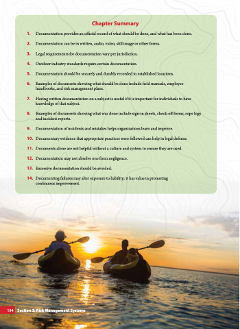 194 Chapter Summary 1. Documentation provides an official record of what should be done, and what has been done. 2. Documentation can be in written, audio, video, still image or other forms. 3. Legal requirements for documentation vary per jurisdiction. 4. Outdoor industry standards require certain documentation. 5. Documentation should be securely and durably recorded in established locations. 6. Examples of documents showing what should be done include field manuals, employee handbooks, and risk management plans. 7. Having written documentation on a subject is useful if it is important for individuals to have knowledge of that subject. 8. Examples of documents showing what was done include sign-in sheets, check-off forms, rope logs and incident reports. 9. Documentation of incidents and mistakes helps organizations learn and improve. 10. Documentary evidence that appropriate practices were followed can help in legal defense. 11. Documents alone are not helpful without a culture and system to ensure they are used. 12. Documentation may not absolve one from negligence. 13. Excessive documentation should be avoided. 14. Documenting failures may alter exposure to liability; it has value in promoting continuous improvement. Section 3: Risk Management Systems