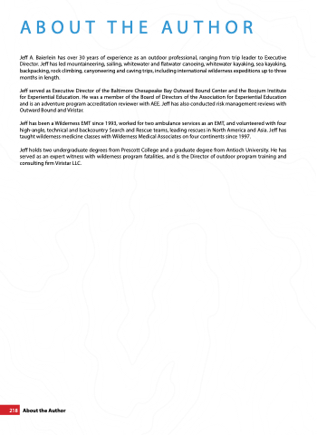 218 ABOUT THE AUTHOR Jeff A. Baierlein has over 30 years of experience as an outdoor professional, ranging from trip leader to Executive Director. Jeff has led mountaineering, sailing, whitewater and flatwater canoeing, whitewater kayaking, sea kayaking, backpacking, rock climbing, canyoneering and caving trips, including international wilderness expeditions up to three months in length. Jeff served as Executive Director of the Baltimore Chesapeake Bay Outward Bound Center and the Boojum Institute for Experiential Education. He was a member of the Board of Directors of the Association for Experiential Education and is an adventure program accreditation reviewer with AEE. Jeff has also conducted risk management reviews with Outward Bound and Viristar. Jeff has been a Wilderness EMT since 1993, worked for two ambulance services as an EMT, and volunteered with four high-angle, technical and backcountry Search and Rescue teams, leading rescues in North America and Asia. Jeff has taught wilderness medicine classes with Wilderness Medical Associates on four continents since 1997. Jeff holds two undergraduate degrees from Prescott College and a graduate degree from Antioch University. He has served as an expert witness with wilderness program fatalities, and is the Director of outdoor program training and consulting firm Viristar LLC. About the Author