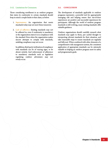 3.4.2. Limitations for Consumers. Those considering enrollment in an outdoor program that states its conformity to certain standards should keep in mind a couple limits to that claim, as below. 1. Impermanence. An organization that meets standards today may not meet them tomorrow. 2. Lack of adherence. Existing standards may not be adhered to, even if conformity is mandatory or the organization states it is in compliance with the standard. Even when the organization makes sincere attempts to comply with standards, unfailing compliance may not occur. In addition, third-party verification of compliance with standards can be of varying rigor, or be absent entirely. And enforcement of adherence to mandatory standards such as legislation regulating outdoor adventures may not evenly occur. 3.5. CONCLUSION The development of standards applicable to outdoor programs represents a powerful tool for appropriately managing risk and helping ensure that out-of-door experiences are positive and successful experiences for participants. Although the world of outdoor program standards is still evolving, many existing standards offer valuable guidance. Outdoor organizations should carefully research what standards may apply to them, put careful thought to interpreting relevant standards for their situation, and take reasonable steps to ensure standards are regularly and fully met. When combined with other elements of a comprehensive risk management system, the consistent application of appropriate standards can be extremely valuable in helping an outdoor program meet its safety and programmatic goals. Chapter 3: Standards 19